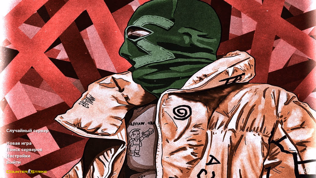 CS 1.6 by Clementine v1 is a custom Counter-Strike 1.6 build created by the YouTuber CLEMENTINE. This version focuses on minimalistic black and white visuals combined with a dark interface and smooth gameplay. The build includes 10 black and white weapon models with unique hands featuring a bracelet watch. The main menu uses a dark theme with red elements. The background shows a muscular man wearing a green mask and an open puffer jacket, giving the build a recognizable visual style.