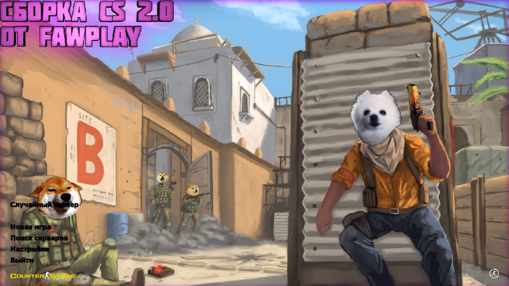 - Main menu background featuring a Dust2 illustration with a terrorist having a white Spitz dog head attacked by CTs with Shiba Inu heads