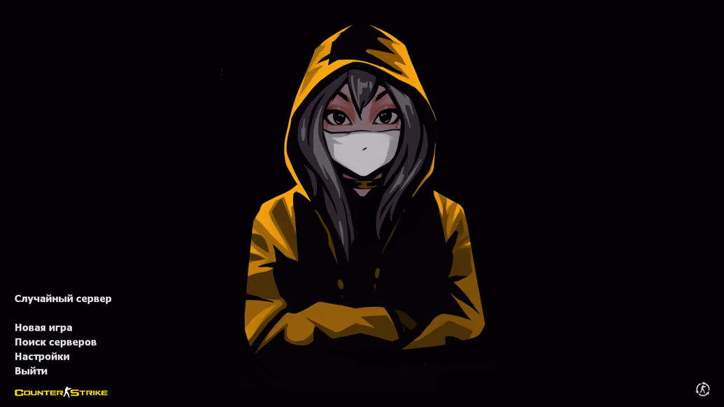 - Anime-style main menu background with a girl in a white mask and yellow hoodie