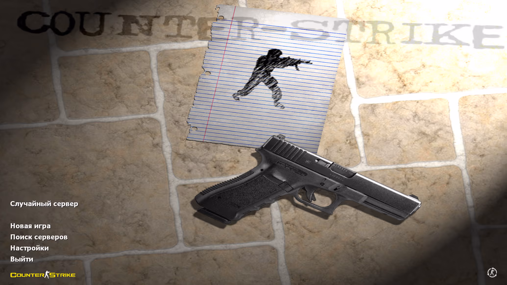 - Main menu background featuring a Glock pistol and a Counter-Strike logo illustration