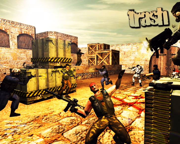 An optimized configuration is included for stable FPS, fast loading and smooth performance. Additional updates include new sounds, new radar, new sky textures and a custom game icon. Menu music is replaced with “Собаки Качалова - Треш и угар”, perfectly matching the trash-style atmosphere. CS 1.6 Trash by Leo keeps all original Counter-Strike 1.6 features. You can play online on more than 250 servers or offline with bots on any map. Full mod support allows installing any additional content.