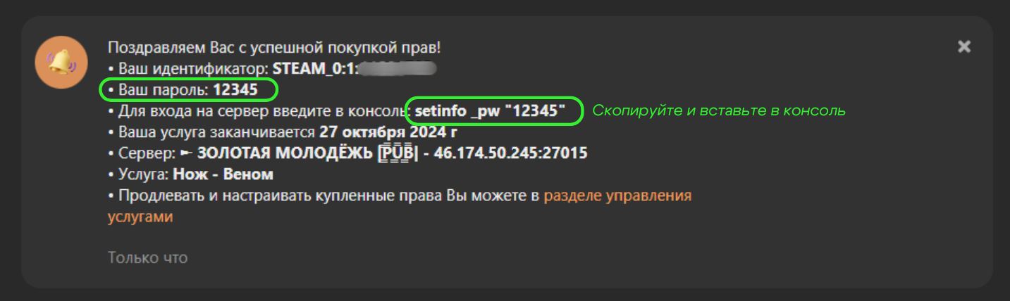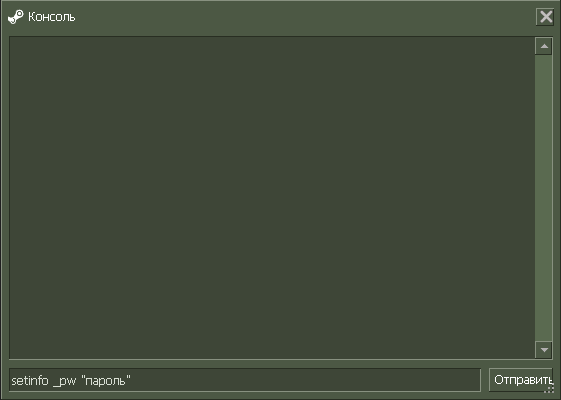 Пароль прописывается командой setinfo _pw "ваш пароль". Вы можете прописать его вручную, либо скопировать из окна уведомления. Если после того, как вы прописали пароль в консоль, у вас все равно не получается войти на сервер, проверьте правильность написания команды. *Пробелы должны стоять перед _ и "!