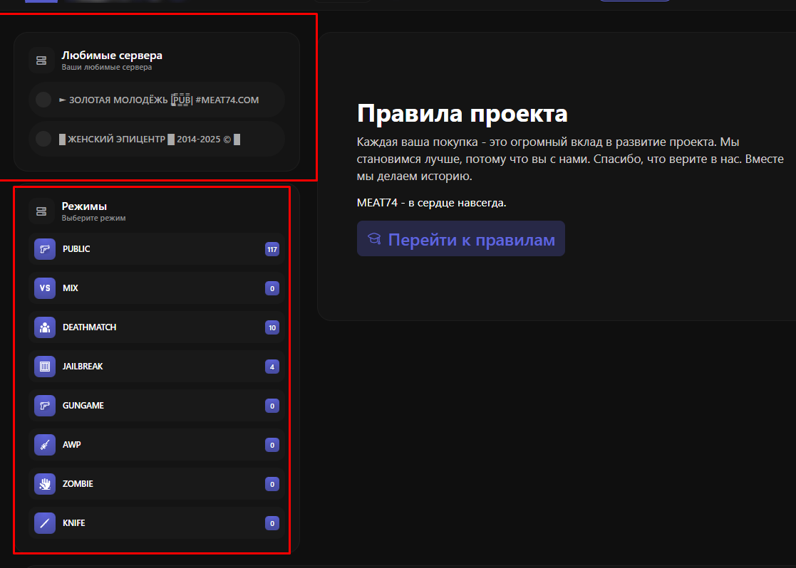 Выбираем нужный сервер - Если сервер добавлен в избранное он будет первый по списку, другие же сервера можно найти в Режимах