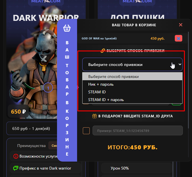 Выбираем способ привязки. Рекомендуем выбирать привязку по STEAM ID. Он есть у ВСЕХ игроков как его найти можно узнать тут . Обращаем ваше внимание,что если STEAM ID привязан к профилю,то в корзине он подтягивается автоматически