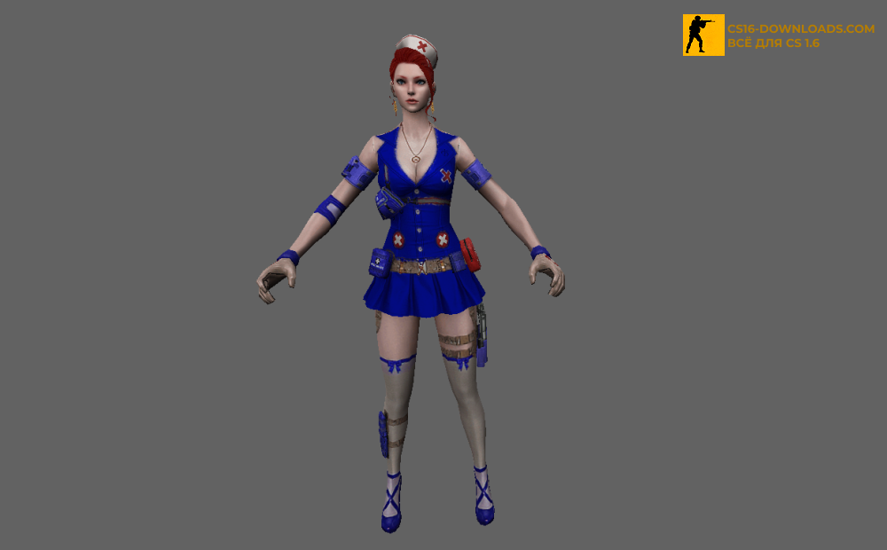 Модель «Медсестра» (ct,tt+united) для CS 1.6 — женский скин с наглядной тематикой, отличающейся от стандартных моделей: детали формы и текстур подчёркивают оригинальность образа. Хорошая проработка позволяет ей смотреться привлекательно на любых картах, а объединённая версия для CT и TT упрощает установку и экономит место. «Медсестра» станет удачным выбором для игроков и серверов, которые хотят внести разнообразие во внешний вид персонажей и добавить игре индивидуальности.